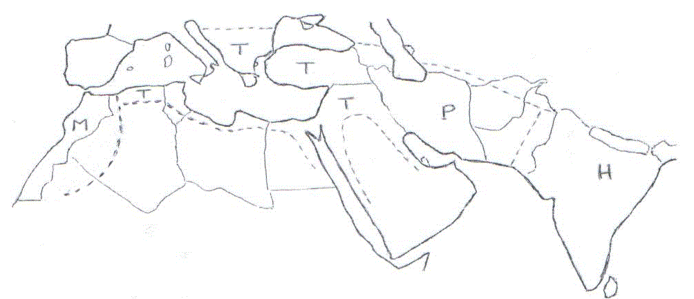 من الشرق إلى الغرب : H الهندستان أو P ، l'Empire Moghol بلاد فارس ،T الإمبراطورية العثمانية ، M الإمبراطورية الشريفة.