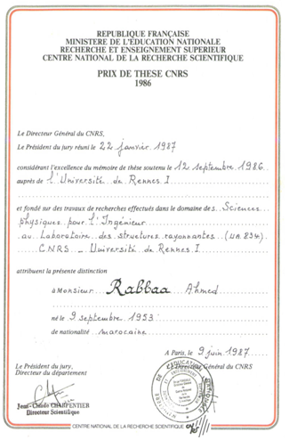 في إطار أبحاث دكتوراه الدولة ، درس أحمد ربّاع وصمّم وابتكر نوعا جديدا من الرادارات يمكن نعته برادار الجيل الثالث G3 ( لن يكون هناك جيل رابع G4 ). الرادار ظهر في بداية الحرب العالمية الثانية ( أو قبلها بقليل ) والجيل الأول كان يتكون من أسلاك تشبه الهوائيات ٭34 antennes الأولى للإذاعة أو التلفزة. وإبان هذه الحرب أُنجزت التجارب الأولى للجيل الثاني من الرادارات ، على شكل صحن parabole يتحرك لمتابعة الهدف cible/target لكنها لم تُستعمل على نطاق واسع إلّا في أواخر الخمسينات ، لسببين : نموّ النقل الجوي وبداية الحرب الباردة. هذا النوع يشبه هوائيات التلفزة عبر الأقمار الإصطناعية ، وهو الذي يوجد في جميع مطارات العالم. لكن في أواخر السبعينات أحسّ المسئولون بأن هذا النوع لم يعد كافيا لحاجياتهم وفكروا في صنع رادار يتيح متابعة أهدافٍ تتحرك بسرعة فائقة ( طائرات حربية جد سريعة أو قذائف صاروخية missiles ). والحل الذي وصلوا إليه له شكل لوحة plaque عمودية ثابتة تضم عددا كبيرا ( قد يتعدى الألف ) من الخلايا cellules تبثّ إشارات signaux وتقوم بدور رادارات جد صغيرة minuscules ، ويمكن التحكم في حصيلة هذه الإشارات بوسائل إلكترونية لمتابعة الأهداف ( دون أي تحرك للوحة ). والشيء الذي لا تبينه الصورة هو شبكة الخطوط lignes de transmission والآليات الإلكترونية الموجودة خلف اللوحة.