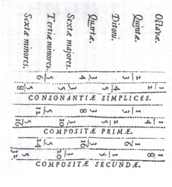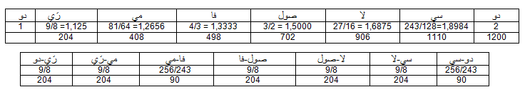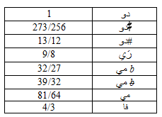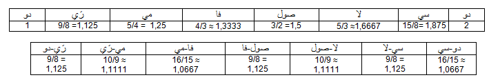 60/30 = 2/1 الأوكتاڤ/ الجواب ، 60/40 = 3/2 الخامسة/المسيطرة dominante ،ا 60/45 = 4/3 الرابعة ، وكذلك 5/4 الثالثة الصافية وهذه الحالة خلقت مشكلا حيّر العلماء والمنظّرين في الشرق والغرب منذ عدة قرون. وهنا نمسّ صميمَ " مبدأ توافق الأصوات "Consonance ( فصل 2 ) الذي هو الأساس لعلوم الموسيقى ويعطينا تفسيرات لقواعدها ونظريتها. ابن سينا طرح " مبدأ التوافق " ودرسه في كتابه " جوامع عِلم الموسيقى " ، موجود بكامله في الإنتيرنيت ٭23 [11]. اعتمد ابن سينا على النِسب لدراسةِ الأصوات المتوافقة وبناءِ سلّم ذي 17 درجة تبنّاه وطوّره الأرموي [12] ( قرن 13 ) وكان سائدا في المشرق العربي حتى القرن 19 ( فصل 5 ) ، وصفه هوبرت پاري Hubert Parry في كتابه The evolutin of the art of music "، 1893 "بِ " أروع سلّم.... " the most perfect ever devised.