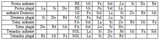 بدأت الديانة المسيحية تنتشر في أوروبا في القرون الأولى للميلاد ، وأعطى حكماءها ( ومن أبرزهم سانت أوڭوستان Saint-Augustin في القرن الرابع ، ذكره الإيطالي Gusto Zampieri في مؤتمر الموسيقى العربية بالقاهرة سنة 1932 ) تعاليمَهم لكي تُجوّد الكتابات الدينية. كانوا يجوّدون نصوصا مستوحاة من الإنجيل أو المزامير psaumes ، بأسلوب شرقي لأن الديانة المسيحية انطلقت من الشرق ، ولها تراتيل شرقية ، ومهدُها مدينة بيزنطة عاصمة الروم المشارقة. تحولت هذه التراتيل psalmodie/cantillation إلى إنشاد تطور ببطء في الكنائس الشرقية ( ستبقى إيطاليا تحت سلطة الإمبراطورية البيزنطية حتى القرن الثامن ) إلى أن أتى منصور بن سرجون التغلبي ( 749 م ). كان يشتغل في بلاط آخر الخلفاء الأمويين ويعرفه الغرب بإسم يوحنا الدمشقي Jean Damascène/ John of Damascus. كان أحدَ أعلام الفكر المسيحي وكان مولعا بالأناشيد الدينية ، وضع قواعدها في شكل أنغام أساسية عددها ثمانية ( لكنها في الحقيقة أربعة مزدوجة ) تبنّتها الكنيسة البيزنطية في الشرق الأوسط. ومن ثم انتقلت إلى الكنيسة الكاثوليكية في القرن الثامن ، تُرجمت إلى اللاتينية فيما بعد وكانت النواة الأولى للأناشيد الدينية التي نتج عنها الغناء البسيط الڭريڭوري Plain-chant grégorien ٭17 في القرن التاسع ، وخلال القرون من 11 إلى 13 تفرّع إلى عدة أصوات ( فصل 3 ). هذه الهيكلة الثُمانية هي ما يسميها الغرب أوكتوئيكوس Octoechos ، الأسطوخوسية ، ذكرتها مصادر عربية ومنها كتاب الأغاني للأصفهاني ( الجزء 3 ) ورسالة الكِندي في اللحون والنغم ( [7] ص 26 ).
