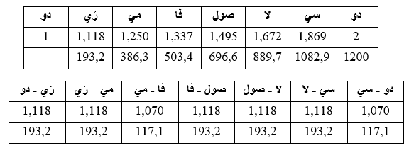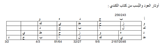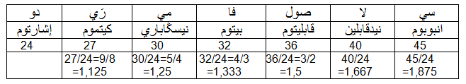 لنأخذ مثالا بسيطا سوف نشرحه مع كل التفاصيل فيما بعد ( فصل 1 ). طول أوتار العود 60 سم ، لنعدّل/نسوّي ونعزف نوطة "دو" على أحد الأوتار. فإذا ضغطنا على مسافة 15 سم من العضمة ونقرنا 45 سم المتبقية سنعزف "فا" ، وإذا ضغطنا على مسافة 20 سم ونقرنا 40 سم سنعزف "صول" ، ومسافة 30 سم ستعطينا الأوكتاڤ/ الجواب أي "دو" العليا ، الخ. ومن هذه الأرقام ستنتُج النِسب التالية :