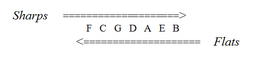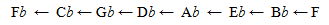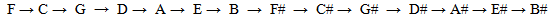 To find the flats, we must make the reverse process on descending by successive fifthts (ratio 3/2) from F. This leads to the series :