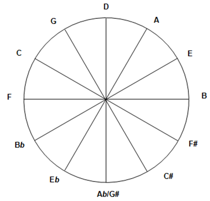 We continue this process by ascending fifths from F# onwards, we’ll arrive at a group of 7 notes shifted/ higher by about a semi-tone :