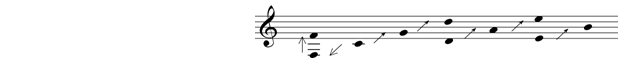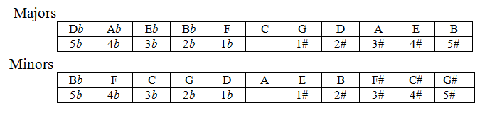 Instead of major G-F or minor E-D (above), if we take any one of the seven (or twelve) notes as a tonic, what are the alterations we must bring to obtain a major or minor mode? For instance, what is the signature of G minor? The answer is : 2 flats B, E. The logical method consists of applying the idea presented above i.e. copying the pattern, but it may need some thinking and counting that we can avoid. This same method leads to an easy series of sharps and flats; one has only to keep in mind this series, in both directions :