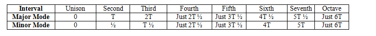 The octave : 6 tones, the fourth (whatever it is, major or minor) : 2 tones and a half, the fifth in both modes (major or minor) : 3 tones and a half. These 2 degrees, plus the octave, are qualified as just or perfect (P) because their distance doesn’t depend on the type of the mode.