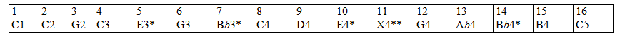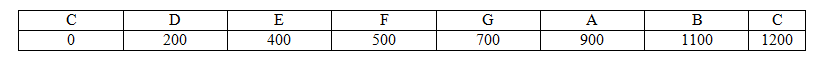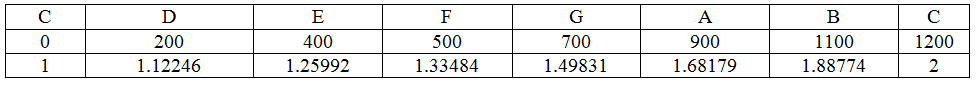2×f = 200 ( C2), 3×f = 300 (G2), 4×f = 400 (C3), 5×f = 500 (E3*), 6×f = 600 (G3), 7×f = 700 (Bb3*), 8×f = 800 (C4), 9×f = 900 (D4), 10×f = 1000 (E4*), 11×f = 1100 (X4**), etc.