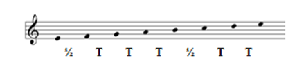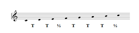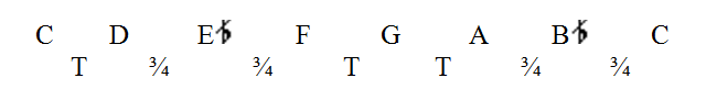 The first and most widespread mode (in the West) is shaped after the scale, the ionian/major, it is therefore a reference and a model (with T = whole tone, ½ = semi-tone) :
