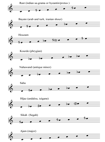There are numerous oriental (arabic, persian, turkish, indian, byzantine) modes (maqams or maqamat in arabic), they haven’t been imposed by theorists (like what happened in the West) but they were set up and have evolved during centuries thanks to great virtuosos. They have their origins in ancient melodies created by musicians, kept alive and improved by generations until being etched on public memory, and finally adopted by theorists. Whereas in the West, theorists of late Renaissance had decreed the prevailing of only major mode, followed by the minor in early Baroque.