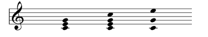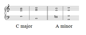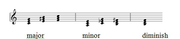 The “triad” is an ancient term that was gradually replaced by “chord” which contains an idea of consonance (II.3) and harmony (although non consonant chords exist). The basic form of a chord is a set of 3 stacked notes i.e. played simultaneously (in a vertical position on the staff) : root, third and perfect fifth, example : C-E-G or A-C-E. The first chord is major since its third (C-E, 2 tones) is major, the second one with a minor third (A-C, 1 tone and a half) is minor. In these 2 cases, the chord is qualified as perfect. Diminish fifth, with 2 minor thirds, is less frequent : B-D-F.