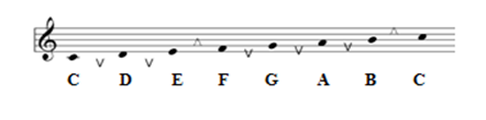 The notes of music (and chant) are expressed by means of several parallel lines grouped in 2 sets, called staves (plural of staff/stave), marked by a particular sign at the left. The most common one is named treble staff; its symbol is G clef. You can see in figure below the tones ˅ and semi-tones ˄ within an octave (notes can be extended to high and low).