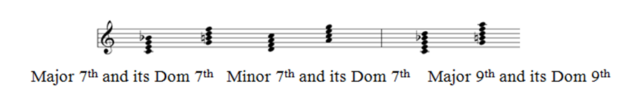 Sometimes we add a 4th note (1-3-5-7 : 7th chord), or even a 5th one (1-3-5-7-9 : 9th chord), this gives numerous chords, here are the most common (with Dom = dominant) :