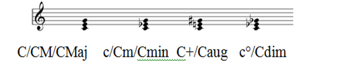 In modern (of american origin) notation we put the root R and add signs/letters which indicate the “quality” of the chords. So if the root is R : capital R (or RM, or RMaj) for major, small r (or Rm or Rmin) for minor, etc :