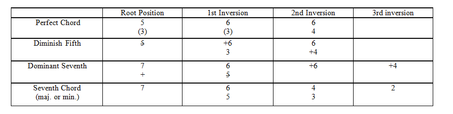 The old baroque notation (still in use) consists of putting down the root and complete by numbers which indicate the “quality” of the chord (root position or whatsoever inversion, major or minor …), example in II.4.