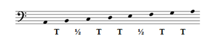 The fifth A-E of 3 ½ tones is just/perfect (like that in the major) but the third A-C of 1 tone and a half is minor. For reasons relevant to Harmony (II), the 7th degree is raised by a semi-tone, the mode is then qualified as “harmonic minor”.