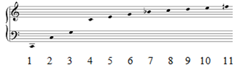 If we consider C1 (2nd ledger line under bass clef), its harmonics cover the whole Grand Staff, and become very close as they get sharp. They are available in all Theory and Harmony courses. The point is that there is a error in all these writings : the 11th harmonic is presented either as F4 or F4#, but in reality it’s a sound in the middle of these 2 notes, denoted F≠ (≠ is a semi-sharp). The next figure shows the successive harmonics of C1 : C2, G2, C3, E3, G3, Bb3, C4, D4, E4, F≠4, etc.