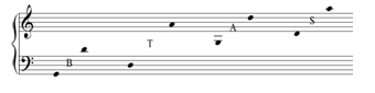 Centuries before that (late M-A and Renaissance), the Art Music consisted of many voices stacked together to form Polyphony style which flourished during 16th century. The Polyphony is a set of 3 or 4 (or more) melodic lines that must comply with a number of rules referred to as Counterpoint. The upper line (chant or right hand on harpsichord, treble clef) became prominent and the other below lines were grouped in bass clef. Afterwards they were reduced to one line featuring the chords : Figured Bass §4. Harmony has evolved gradually during roughly 3 centuries to become what is known as Common Practice, i.e. the classical or modern style of western music, where the chords and their progression are prevailing. All over this evolution process, the relation between vertical notes have been based on Consonance (euphony/ harmoniousness §3) which is governed by acoustical laws (in the physical sense, III and [Ac]), as we’ll see in the next chapter on “Music Acoustics”.