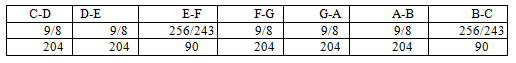 The other steps, E-F and B-C, denoted by the term “leimma” are considered as half a tone or semi-tone. Their value of 256/243=1.0535 (or 90.2≈90 cents) is smaller than the half of a standard tone (100 cents).