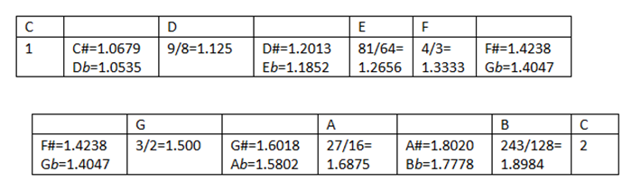 And so on, we can determine the ratios of the following notes using the same process : each time we multiply by 3/2 to get the next fifth, and if it exceeds 2 we must lower it on dividing by 2 . With "X" = ratio of X :