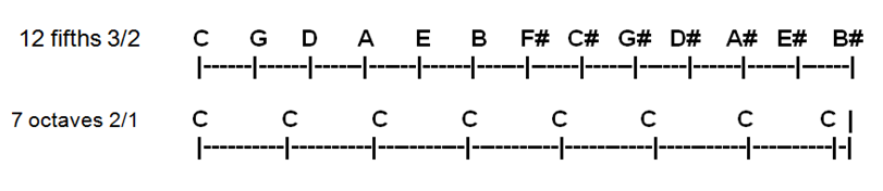 Let’s examine the series of sharps : if you start from C to determine the 7 notes of the diatonic scale, and continue from F to obtain other 7 notes all with sharps, le last note is B#, considered as equal to C in modern key-board. What is the exact pitch of B# ? To pass from C to B# we cover the span of 12 fifths of ratio 3/2, whereas it needs only 7 octaves of ratio 2/1. The global distance in both cases is : (3/2)12 = 129.746 and 27 = 128. The problem is that these 2 numbers are not equal, B# is a little higher than C.