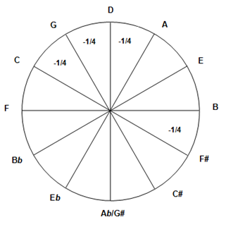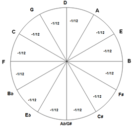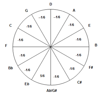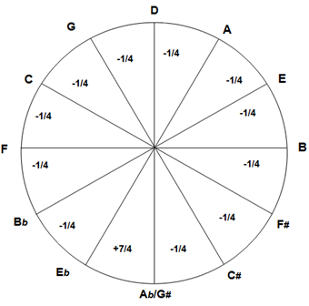 Otherwise we can use a circular chart with fifths of exactly 3/2 = 1.5 , but there is a lack of one comma that we should take into account, usually denoted -1 and placed between Eb and G# (these 2 notes never meet in a mode), and 0 elsewhere along the 11 other fifths [Th, p87].