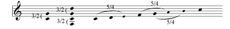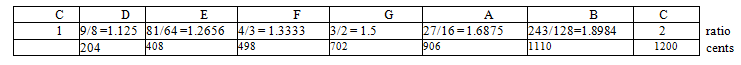 The result is a scale where whole tones are not equal. The value of C-D is 9/8 like earlier, but what about D-E ? The third C-E is 5/4, it remains only 10/9 (182 cents) for D-E :