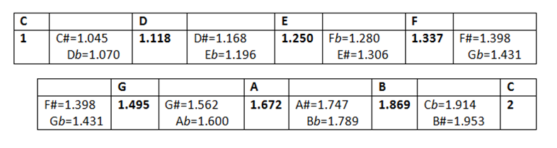 The fundamental “f” is harmonic n°1, 2xf is n°2 harmonic, 3xf is n°3 harmonic, etc …. So the various harmonics have, with the fundamental, the fellowing ratios : 2, 3, 4, 5, 6, 7, 8, 9, 10, 11, etc. and almost all of them are outside the octave. To bring them inside the octave, we must divide each of these numbers by 2, one or several times until getting a value comprised between 1 and 2 : 1 for tonic/root C, G is 3/2, just/harmonic E is 5/4, Bb 7/4, D 9/8.