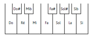 The drawing of the piano key-board shows how to divide each tone by inserting a black key, the result is that the total span of the octave is 12 semi-tones, among them only 7 at most are taken to create a melody. These 7 notes form a “mode”, or “key” (although “key” denotes also one element of a piano or organ key-board), or “tonality” (tonality is more related to what is “tonal”, i.e. the style in practice since late 17th century, with prevailing of chords II).